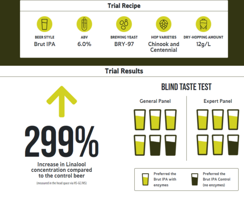 Szemléltetésként itt van egy a Lallemand által készített felmérés eredménye. Lefőztek egy egyszerű brut IPA-t, amit utána két erjesztőbe elosztottak. Az egyik tankhoz Aromazyme-ot adtak, míg a másikhoz nem. Mindkét tartályban ugyanannyi sör volt, ugyanúgy volt erjesztve (párhuzamosan) és 12g/L arányban hidegkomlózták ugyanannyi ideig Centennial és Chinook komlókkal.